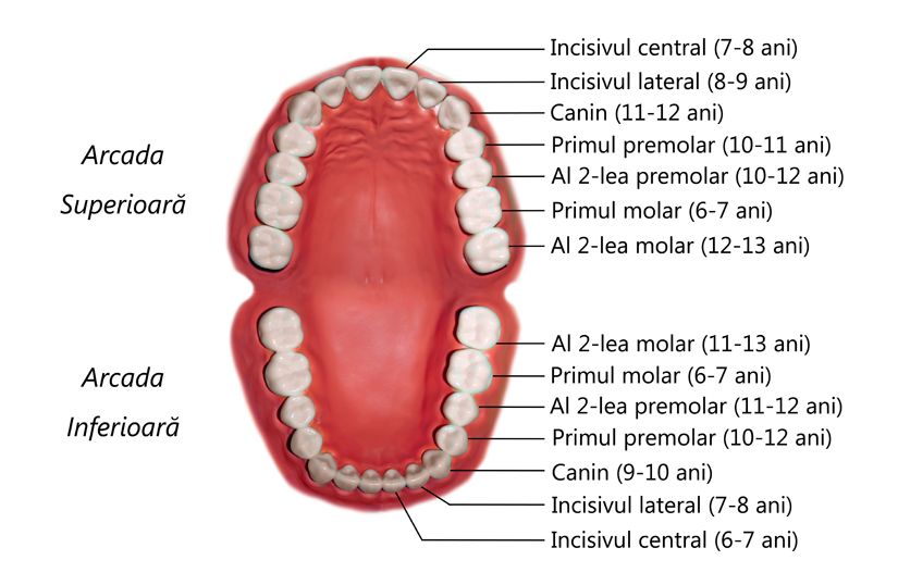 Apariția dinților definitivi diferă de la copil la copil dar în general ordinea de erupție pentru fiecare dinte este: